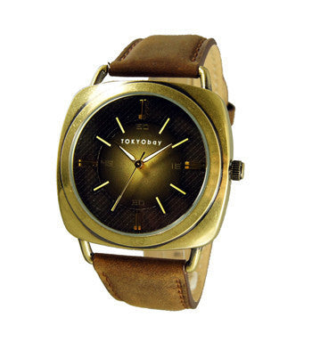 A casual style watch with character , retro design dial in brown. The watch case has softened round edges for a smooth profile. Plated with an aged gold or aged silver finish. The genuine leather band has a slightly 'worn in' look and texture. Case size is 1 1/2".