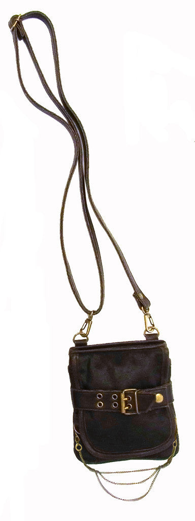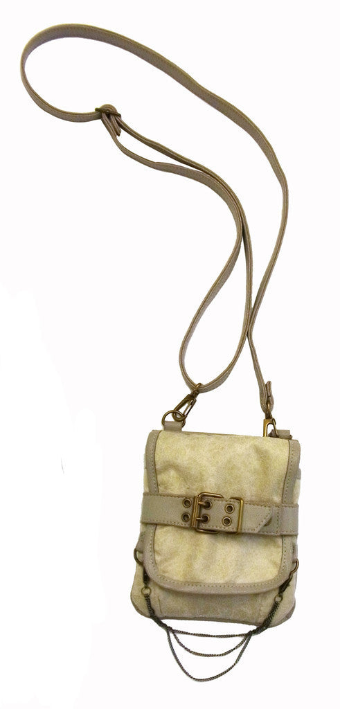 New larger more phone friendly essentials bag. Distressed and vintage look vegan leather fabrics with metal details treated in antique brass finish. An adjustable strap for cross body or around hip choice. 5"w x 6"h