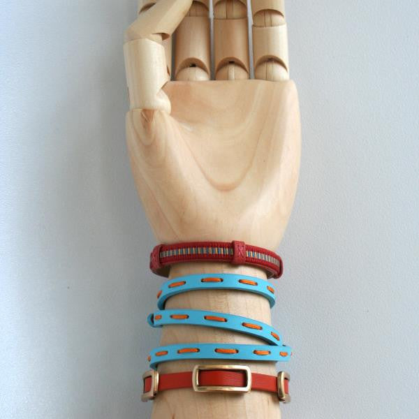 COLOR CORD (turquoise): A slim triple wrap leather bracelet with bright orange contrast nylon stitch that gives this stacking look a pop of color. The slide through fastener acts as a decorative stainless steel buckle. Also comes in orange, green, brown, tan & ivory.