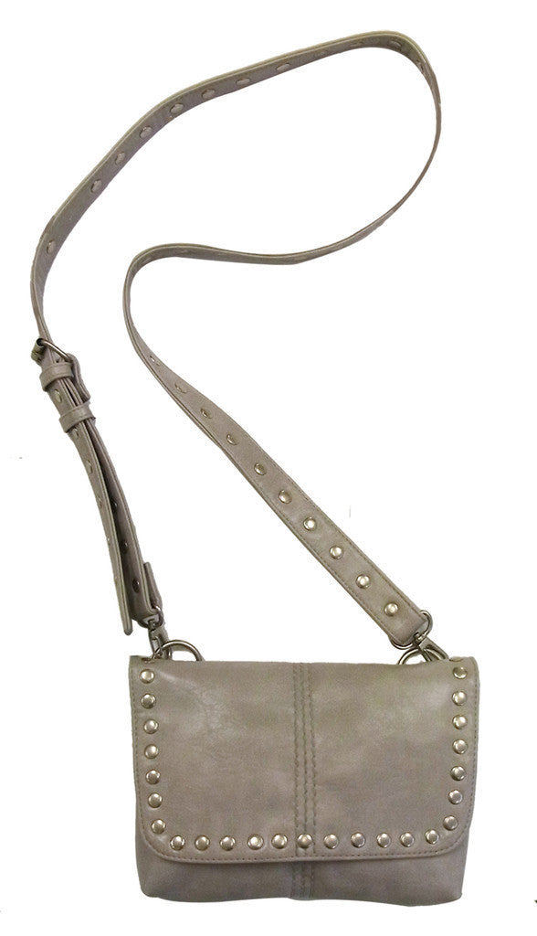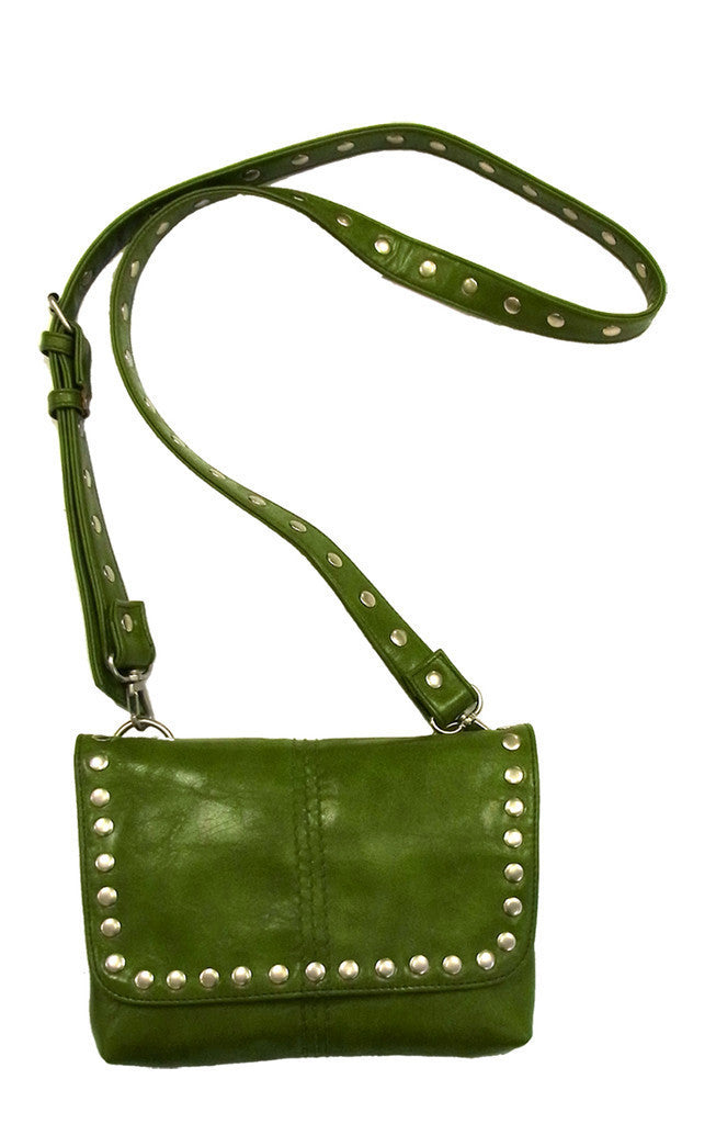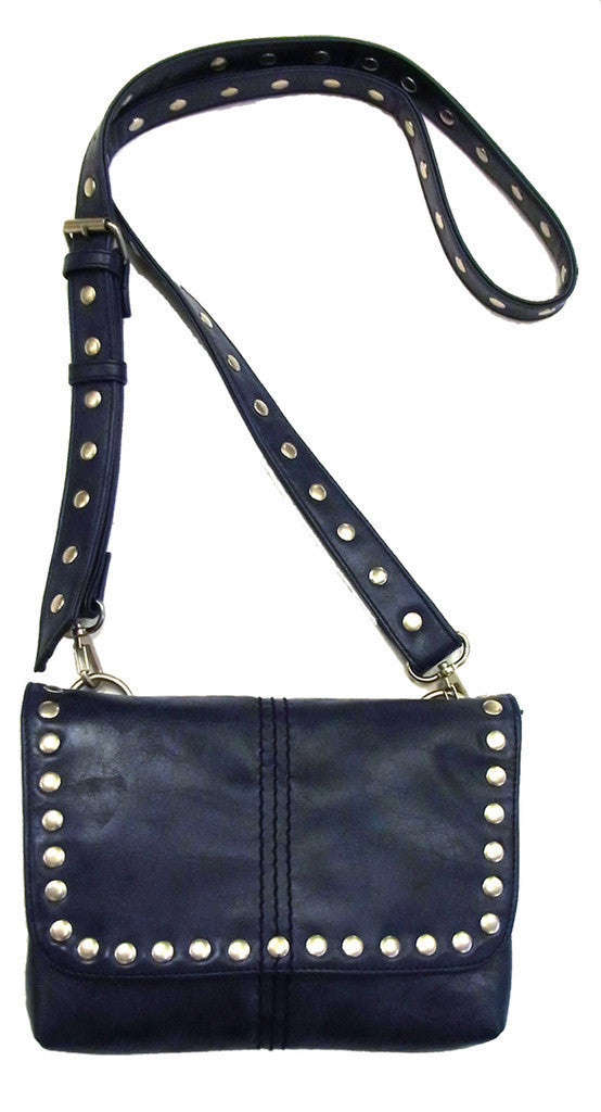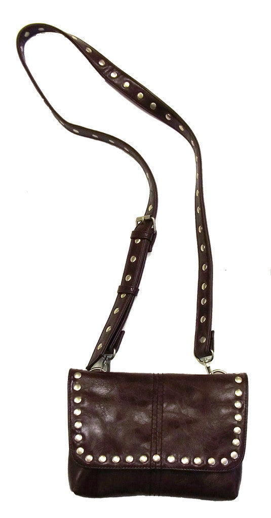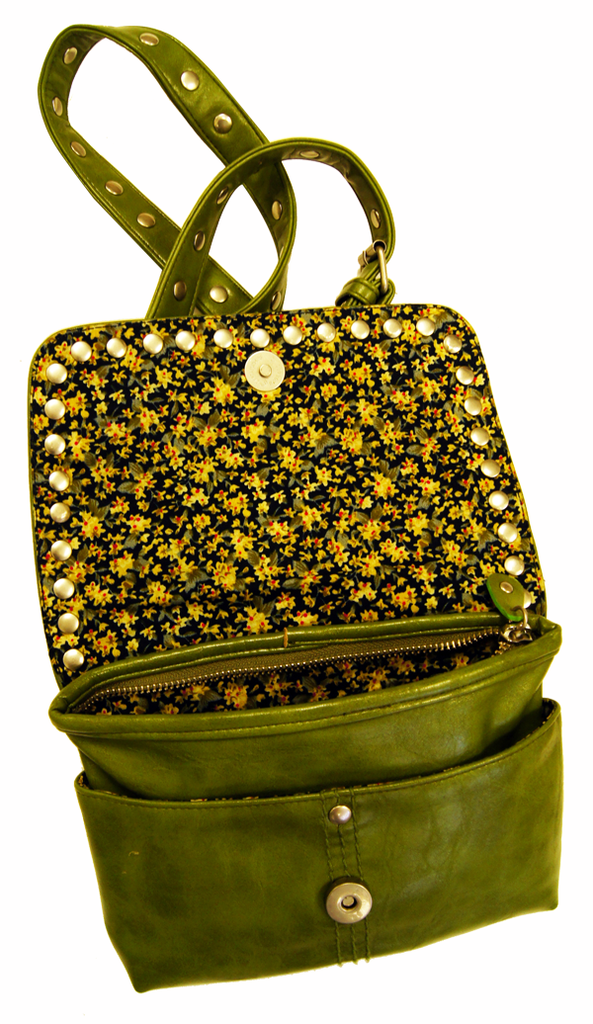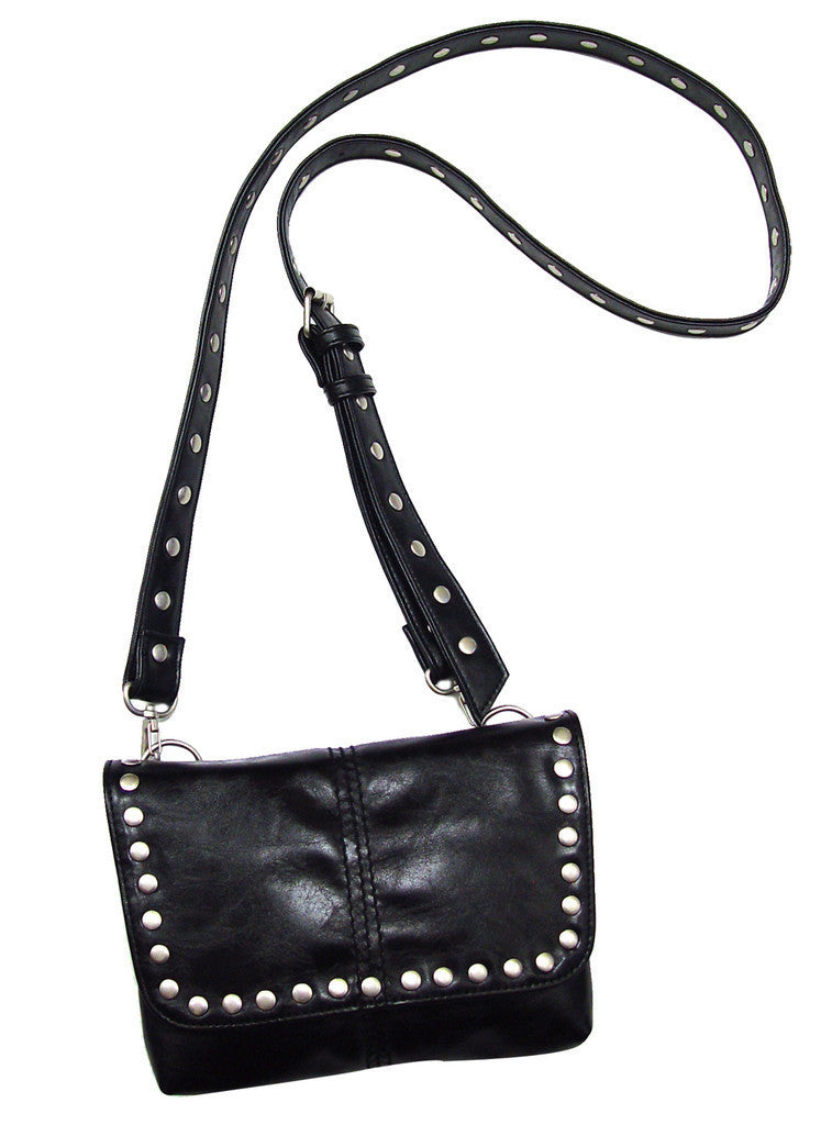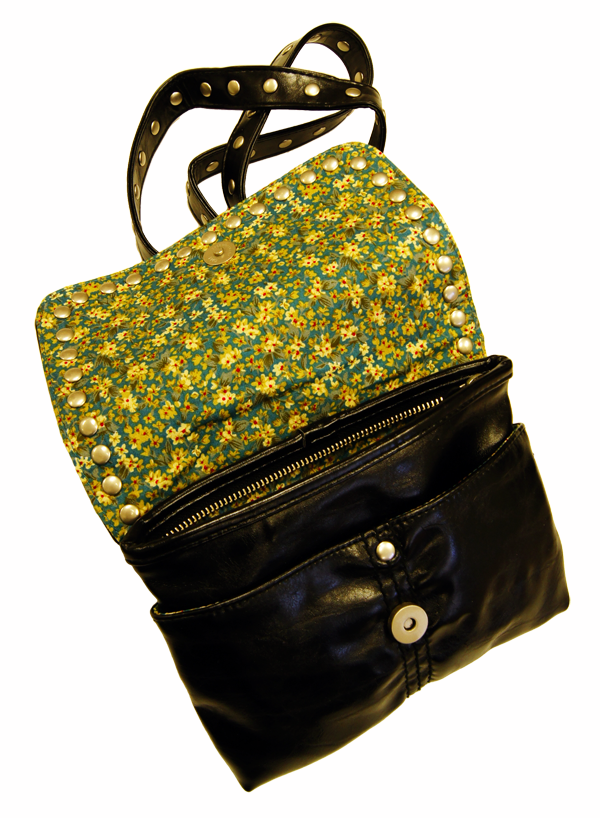 Compact and functional, the stylish cross body bag has a zippered compartment and a front open pocket with snap closure. The studded adjustable strap is long to be worn cross body or low on the hip. The strap can be removed to use as the perfect clutch purse. Vegan leather, fully lined in a cotton floral print works from day to evening. 8"w x 6"h x 1.5"d