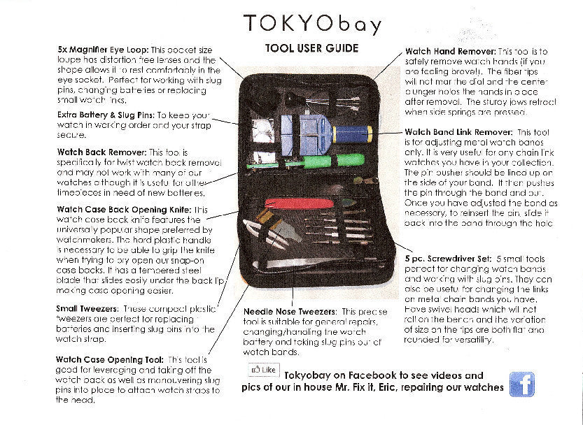 The 'Do it At Home' TOKYObay Tool Kit contains a 5x magnifier loop, extra battery and slug pins, watch back remover, watch case back opening knife, small tweezers, watch case opening tool, needle nose tweezers, watch hand remover, watch band link remover & 5 piece screwdriver set. Each kit comes with a tool user guide.