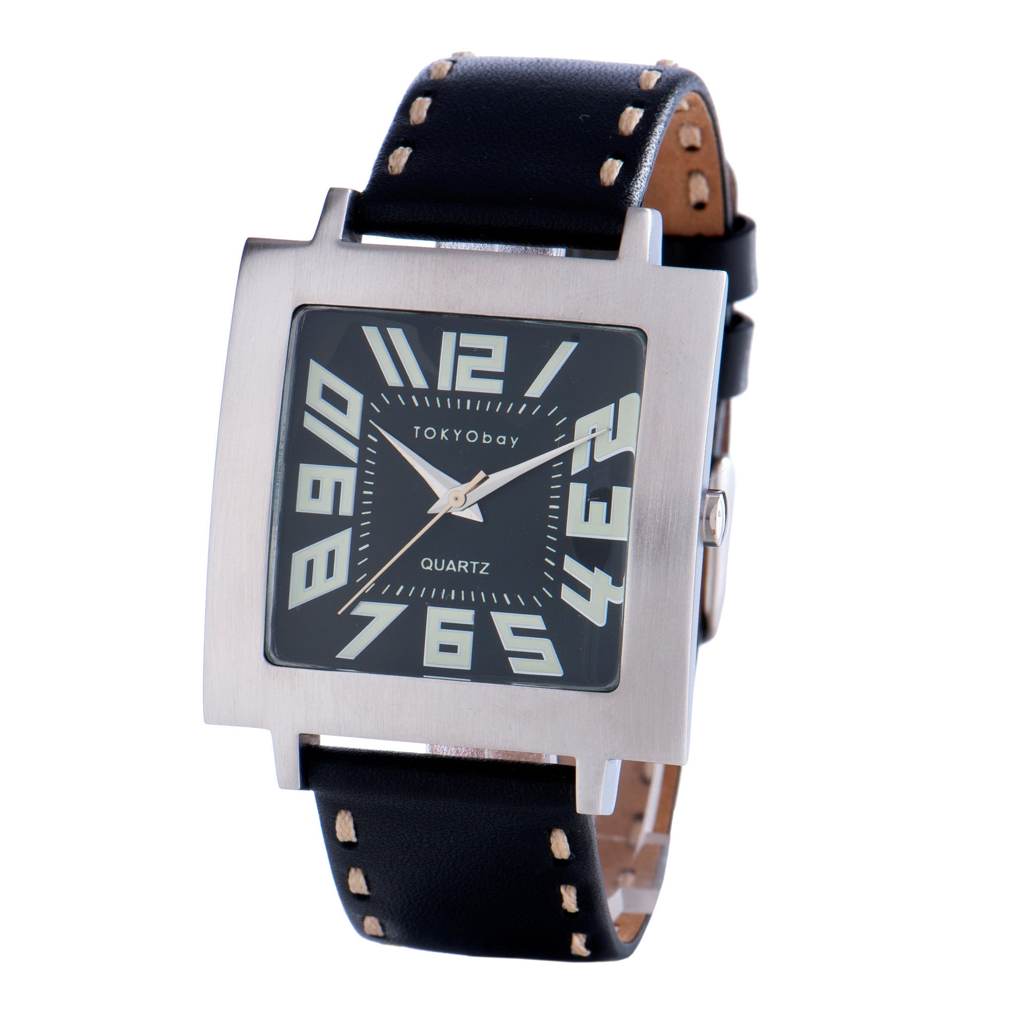 As featured in Oprah Magazine. A bold statement piece. Unisex, square two-toned dial with retro feel. Smooth leather strap and heavy top stitch detail. Case size is 1 1/2".