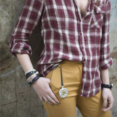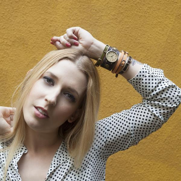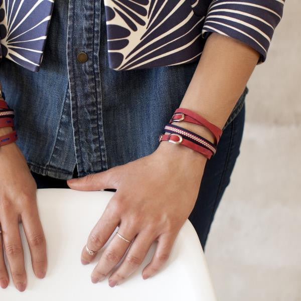 A sueded feel leather diluted washed color and 3 oval buckles, one of the 3 being the functional fastener.